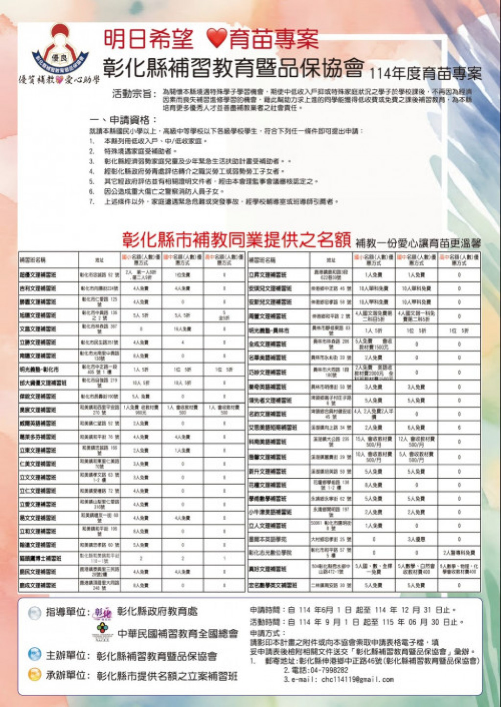 彰化縣補習教育暨品保協會114學年度「關懷弱勢-育苗專案」活動實施計畫