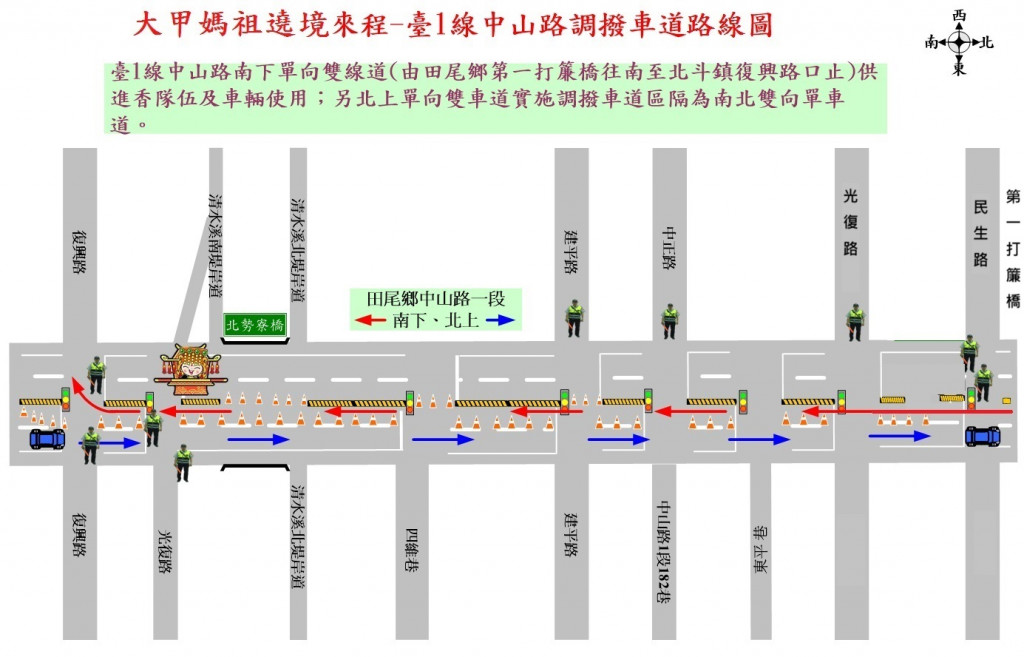 交通安全宣導:彰化縣警察局北斗分局為維護115年4月19日「大甲鎮瀾宮天上聖母遶境進香活動」行經期間交通秩序,將視交通狀況彈性管制車輛。