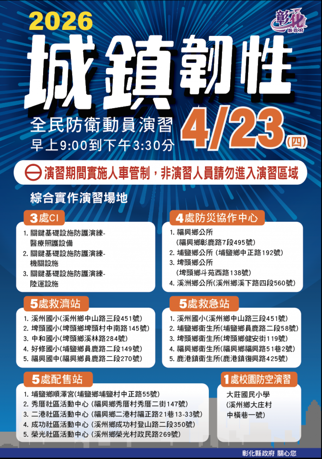 | (一) | 彰化縣政府謹訂於115年4月23日(星期四)於福興鄉、埔鹽鄉、埤頭鄉、溪州鄉等4個鄉(鎮、市)辦理彰化縣2026城鎮韌性(全民防衛動員)演習。 |